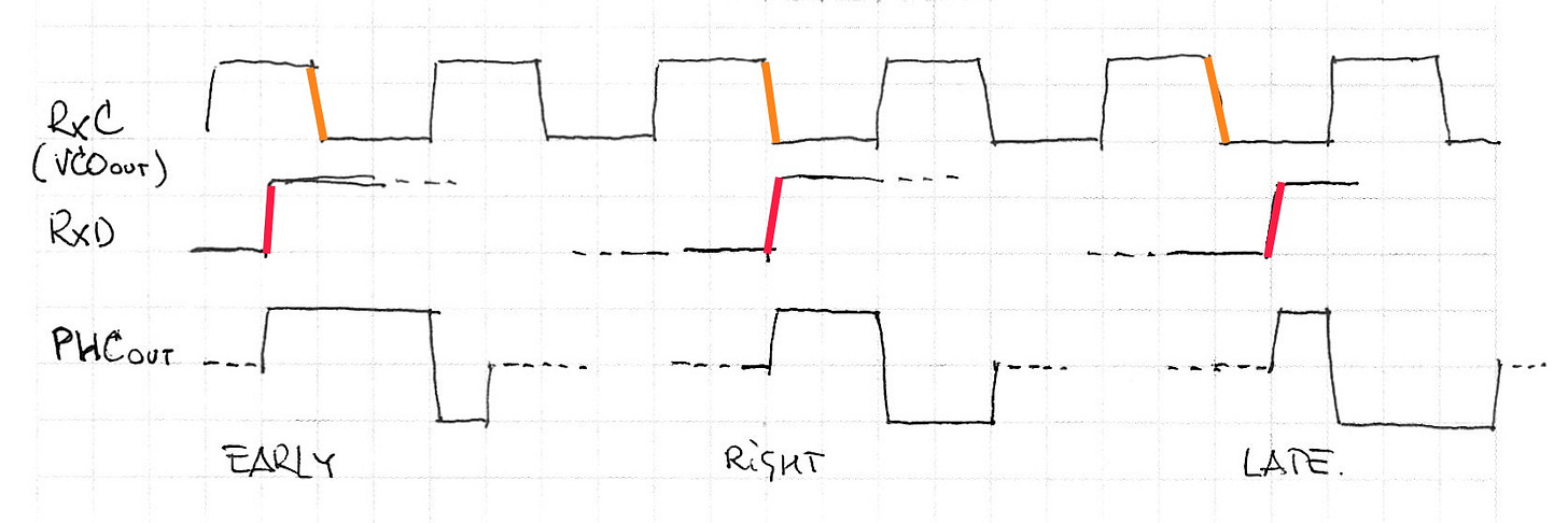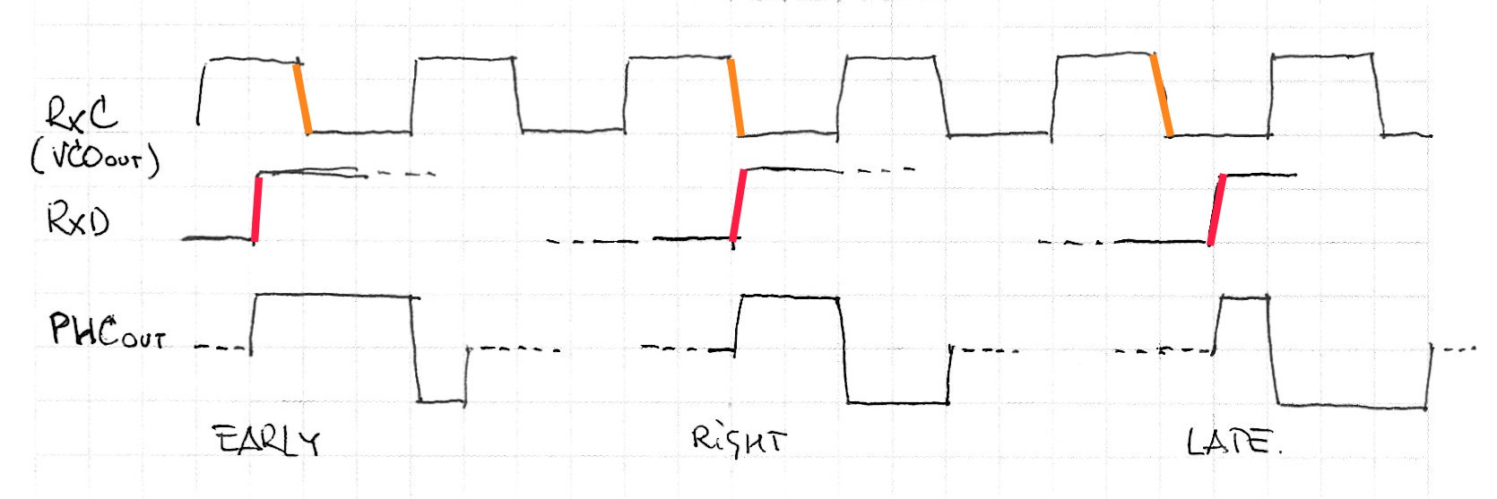 In the figure that follows we can see the phase comparator output when data arrives early, just in time (aligned with clock falling edge) and late.