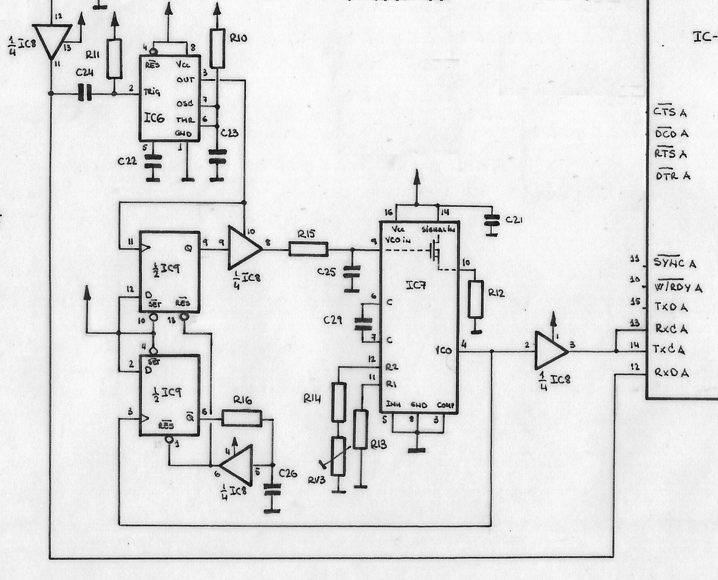 Later on, a VCO rising edge will come. This will set the lower flip-flop setting nQ output to low level. R16 by C26 time constant should be very short and after a very small delay, nRES becomes low (active) and the two flip-flops will reset. This sets triestate buffer low level while the bit period lasts.