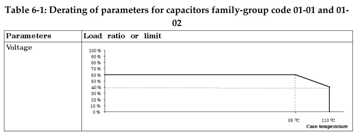 For every family group applies different guidelines. For example, derating requirements for capacitors apply for maximum DC voltage and have a derating factor of 60 % at low temperature.