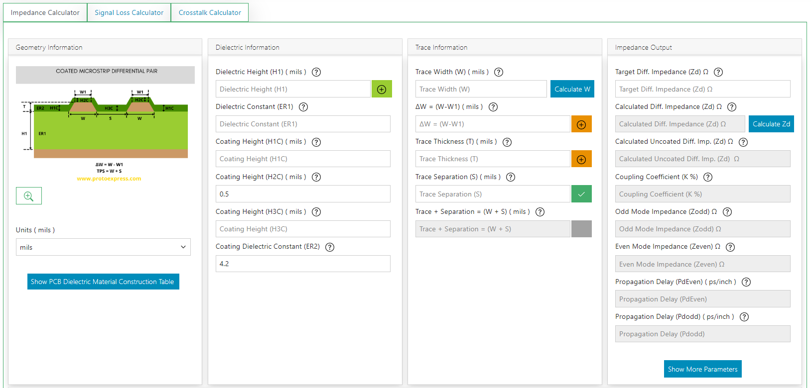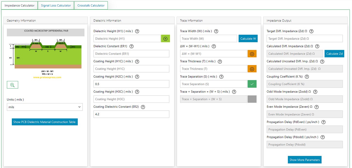 In the last few months I have discovered a Maxwell equation’s solver for transmission lines that is available online by Protoexpress, which is a PCB manufacturer. The Impedance Calculator is one of the Designer’s Tools they provide and it is a very high quality one.